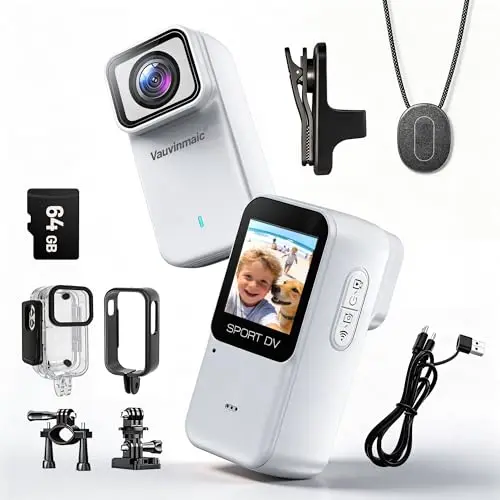 【Cámara Compacta 4K】Resolución 4K, lente gran angular de 120°, solo 53.5g, con pantalla de 1.47" para previsualización. 【Impermeable y Resistente】IPX7, hasta 30m bajo el agua, operación de -20°C a 60°C. 【Modos de Grabación】Retrato/ paisaje, batería de 1000mAh, grabación en loop, y conectividad WiFi.