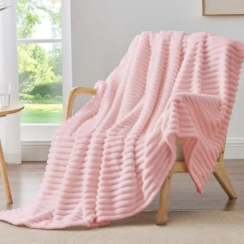Manta de felpa rosa de 300GSM con diseño de rayas, suave y acogedora, perfecta para todas las estaciones y fácil de cuidar.